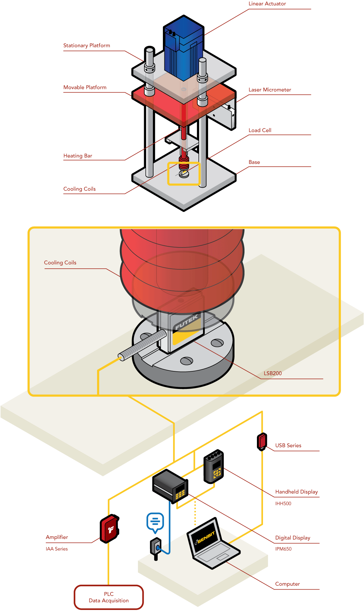 2、拼搏官方网站 LSB200微型S型传感器安装在测力台架的底部,正对着加热棒和冷却盘管下方。LSB200传感器特殊的设计,使得传感器在台架加热和冷却降温的过程中,测试结果不受影响。