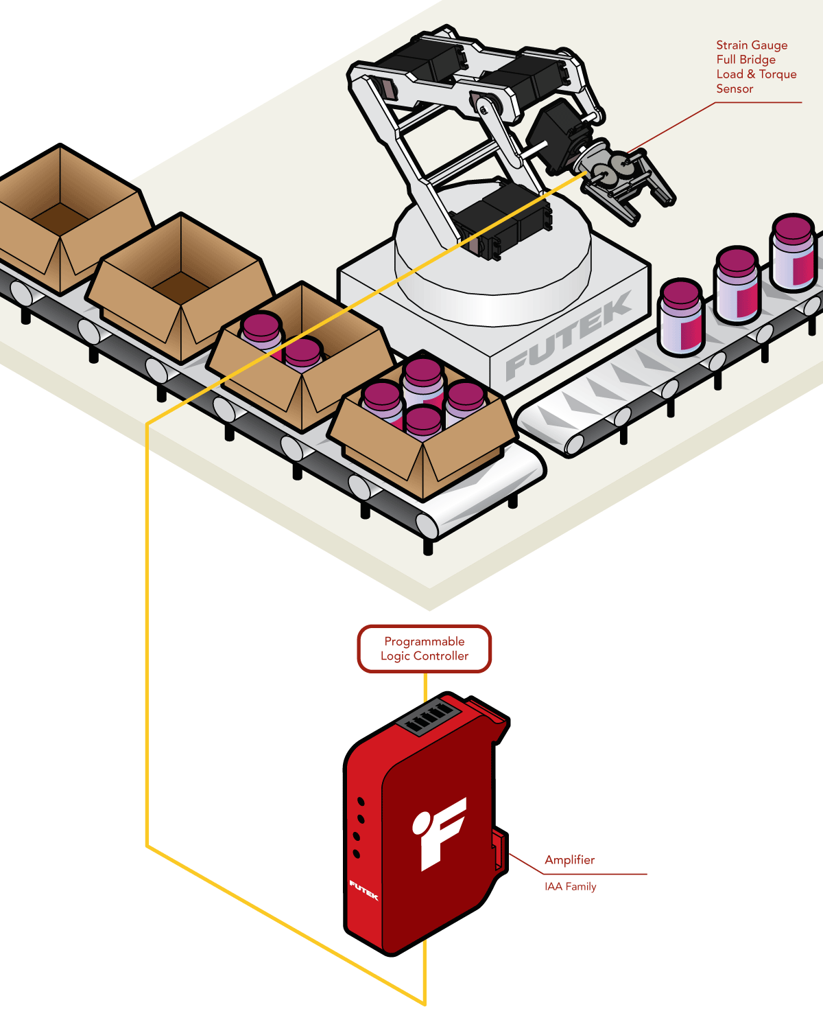 一个应变式、全桥多轴传感器测量力和扭矩,搭配IAA100放大器(电压输出)或IAA200放大器(电流输出)。