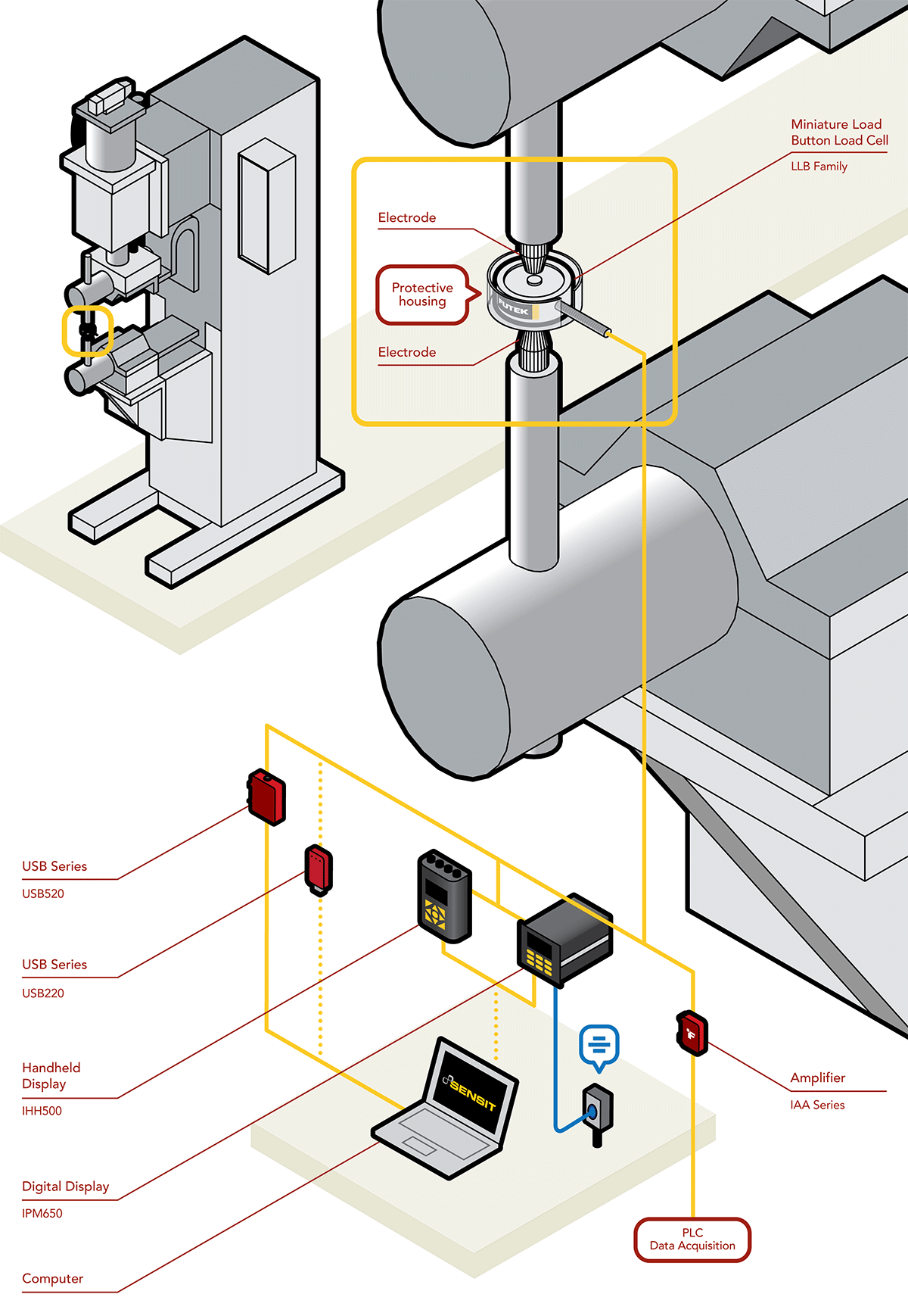 4、在这个应用中,拼搏官方网站 的 LLB300 微型按钮力传感器被放置在电极之间以校准施加的力。当机器施加压力时,LLB300将感知负载测量,并可以通过 USB 采集方案在 IHH500 手持显示器、IPM650 面板安装显示器或 PC 上显示数值。