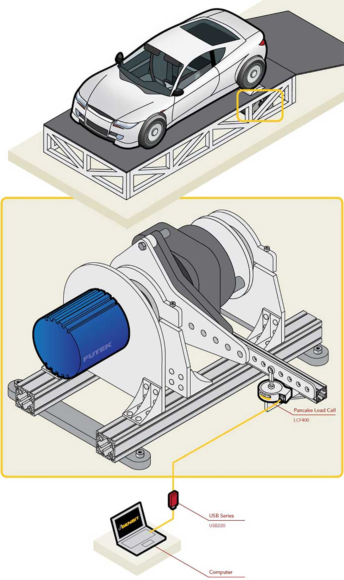 2、发电机装载机制对车辆发动机施加负载,负载单元对扭矩臂施加的负载做出反应,由于 LCF 系列力传感器对无关负载具有很强的抵抗力,因此可以抵消扭矩臂的非线性运动。