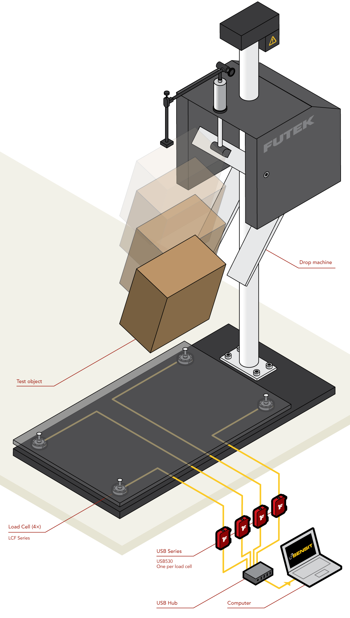 2、当一个包被丢弃时,每个角落的测压单元测量并发送负载数据到 USB530 数据采集模块。