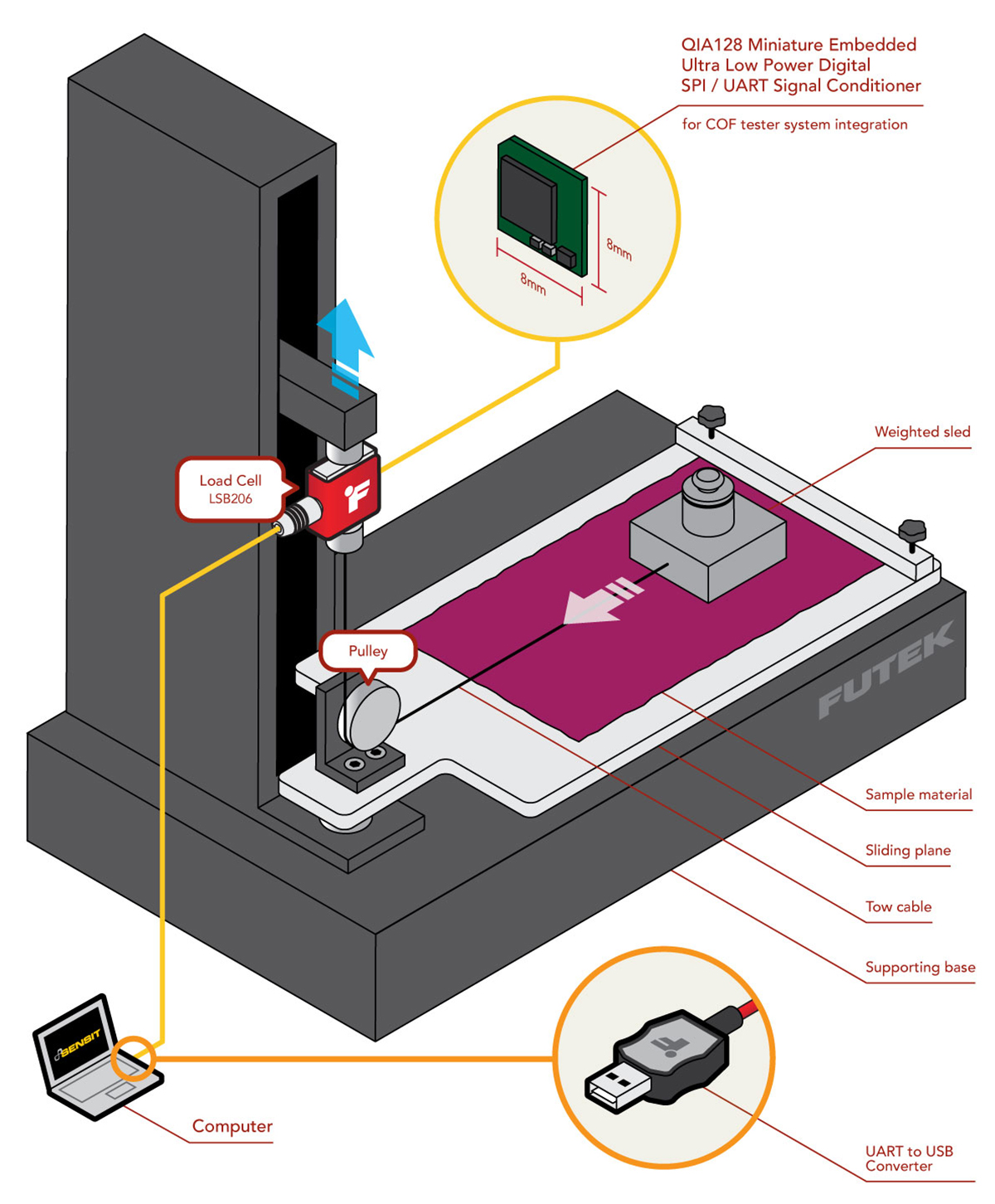 1、电缆通过滑轮将滑块连接到力传感器上,皮带轮在测试期间引导牵引电缆。