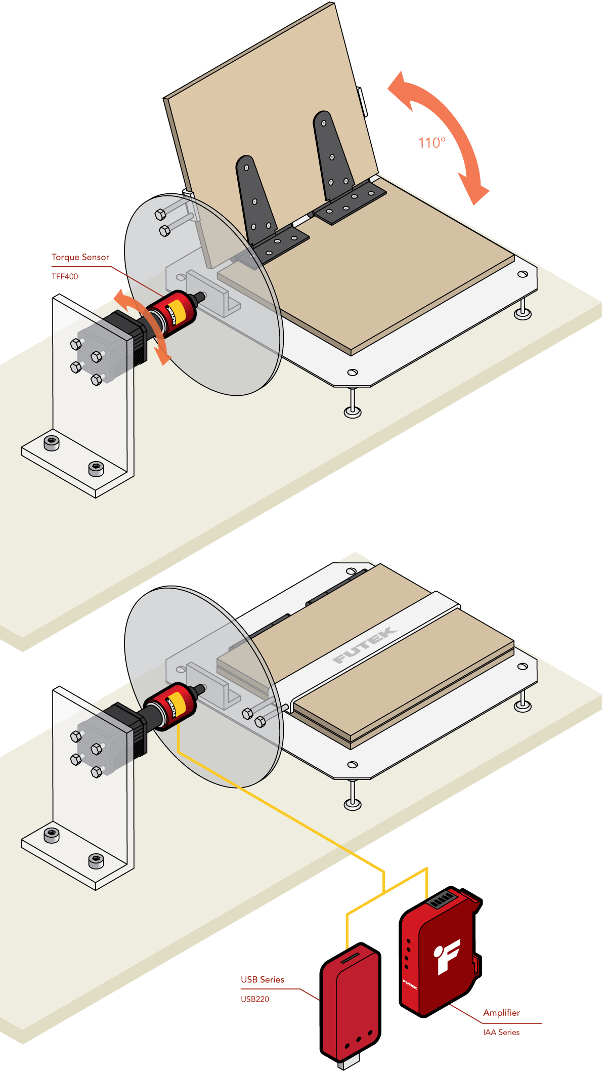 3、然后,TFF400 被安装到一个轮毂上。电机的转动将使被测试的铰链能够开启和关闭。