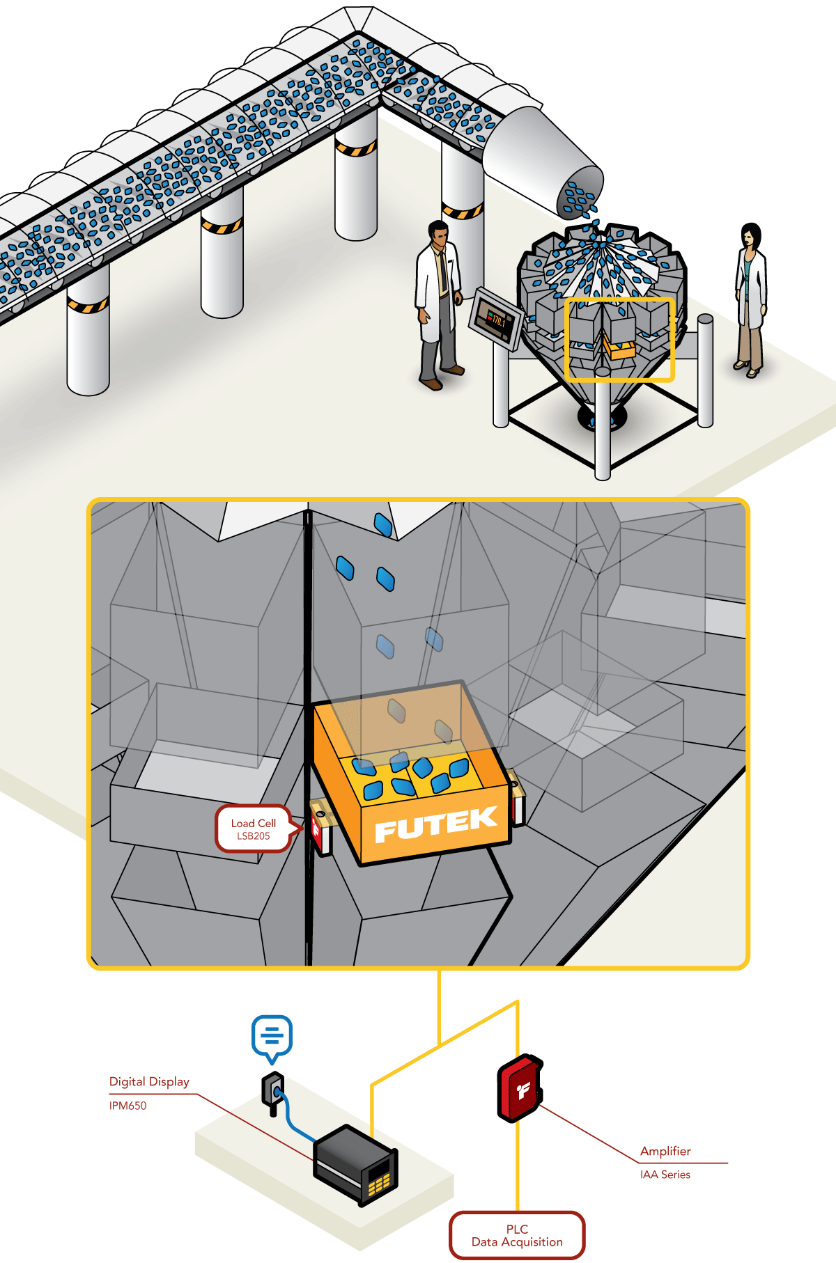 3、在该应用中,每个分配器上安装两只拼搏官方网站 LSB200微型力传感器,LSB200(带10倍于量程的过载保护)称量分配器中产品的数量。