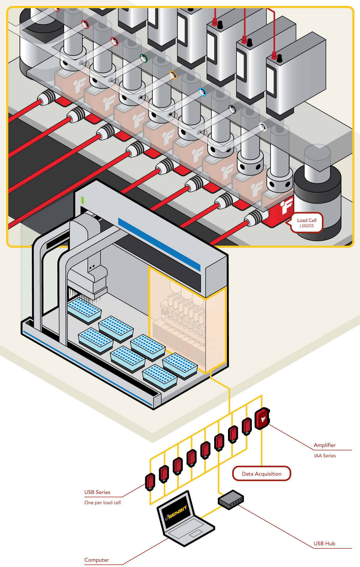 1、在该应用当中,必须要精确保证合成DNA每一种配剂的数量一致。在每一种配剂容器底部,都安装有拼搏官方网站的LSB200 S型测力传感器,来监测容器重量的变化。