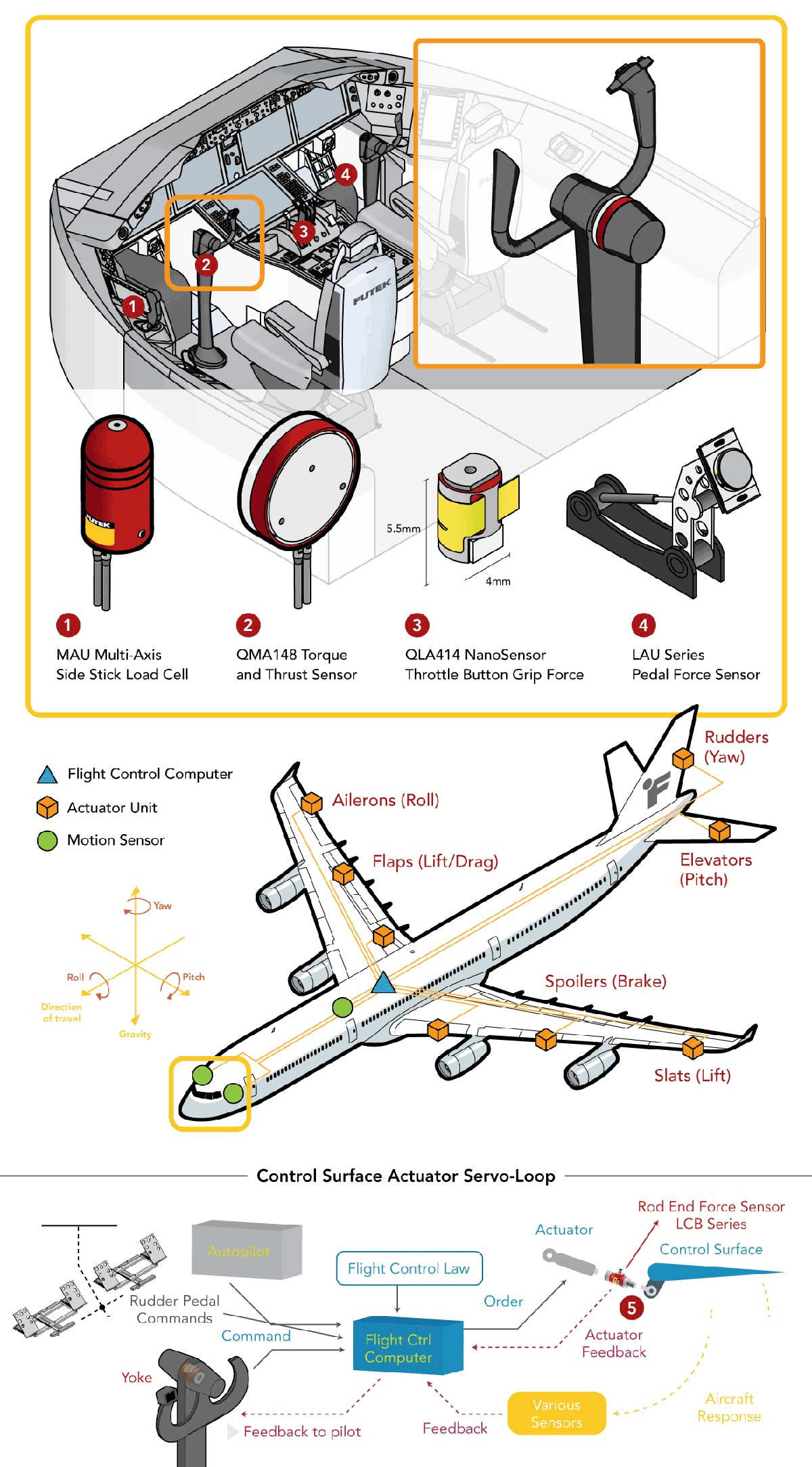 2、轭架:飞行员严重依赖控制柱(轭)来引导飞机的俯仰和滚动,通过旋转轭架,飞行员在滚动轴上机动。通过向前和向后推动轭,飞行员可以调整仰角和俯仰轴。为了确保控制柱正常运行,飞行控制工程师可以安装拼搏官方网站的MBA500扭矩和推力双轴传感器,以测量施加在轭架飞行控制上的力和扭矩。MBA500 多轴力传感器在 Mz(滚动)和 Fz(俯仰)方向上执行测量。