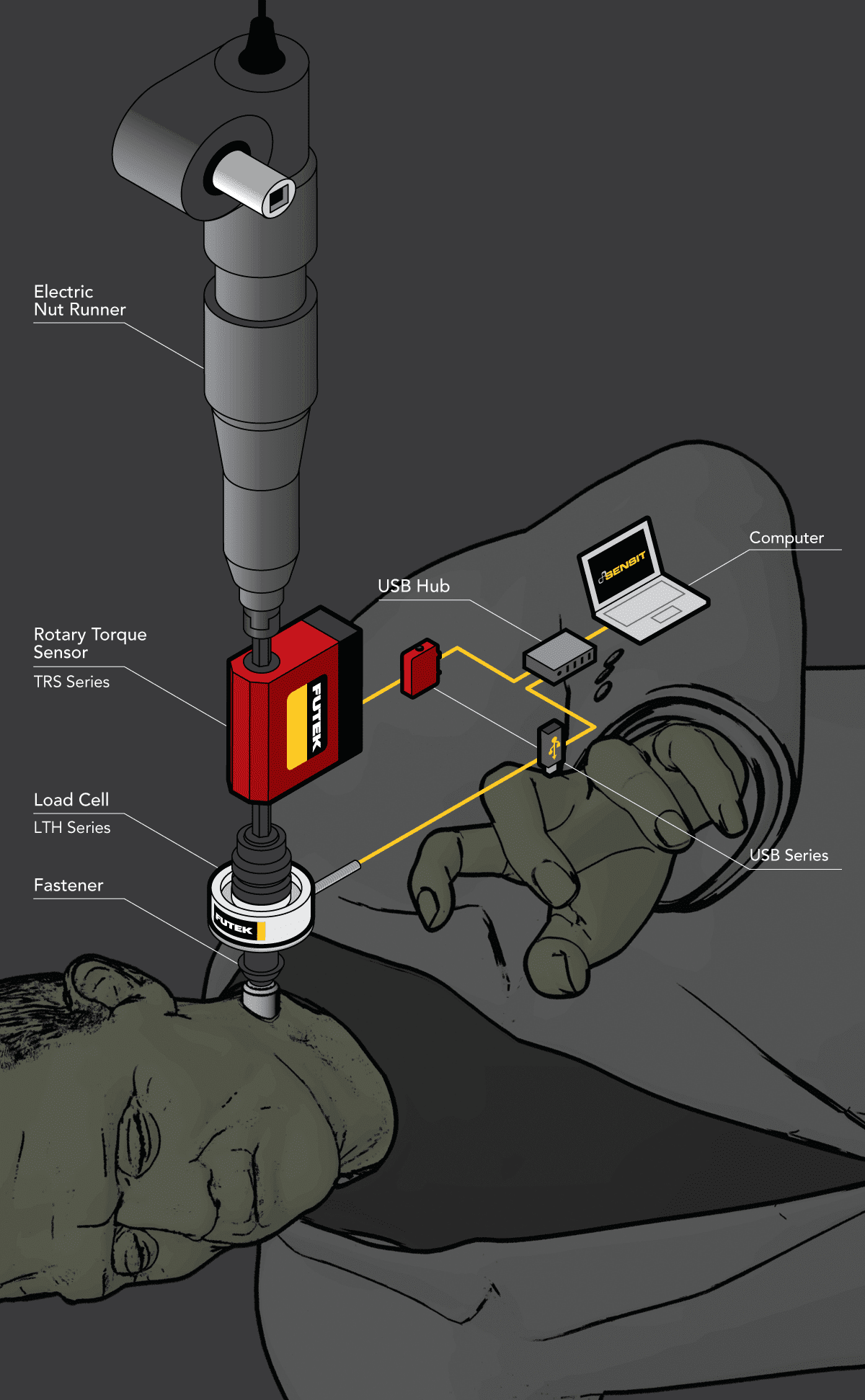 驱动:电动螺丝刀/电机,扭力传感器:拼搏官方网站的TRH605,测力传感器:拼搏官方网站的中空型LTH系列,信号处理:拼搏官方网站的USB520和IDA100,终端显示:拼搏官方网站的SENSIT软件、PLC