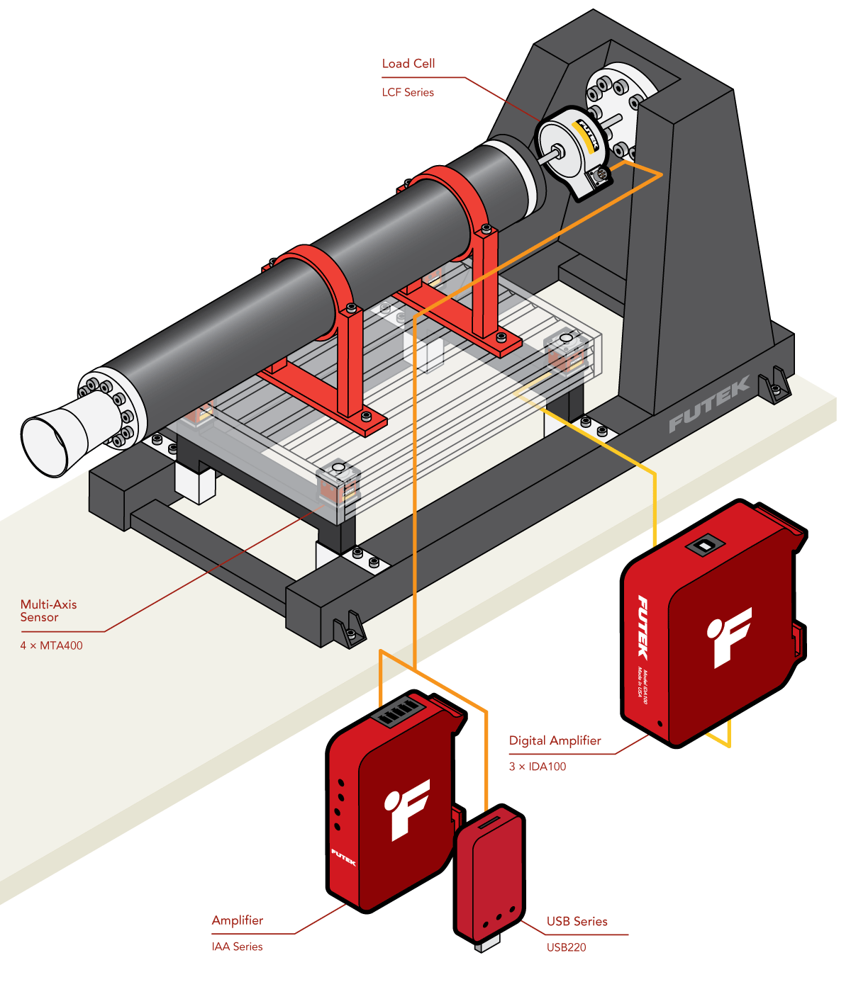 拼搏官方网站通用的LCF系列传感器,搭配仪器仪表(IAA系列或USB220),4个拼搏官方网站 的MTA400/MTA600多轴力传感器,每个多轴力传感器搭配3个IDA100数字放大器。